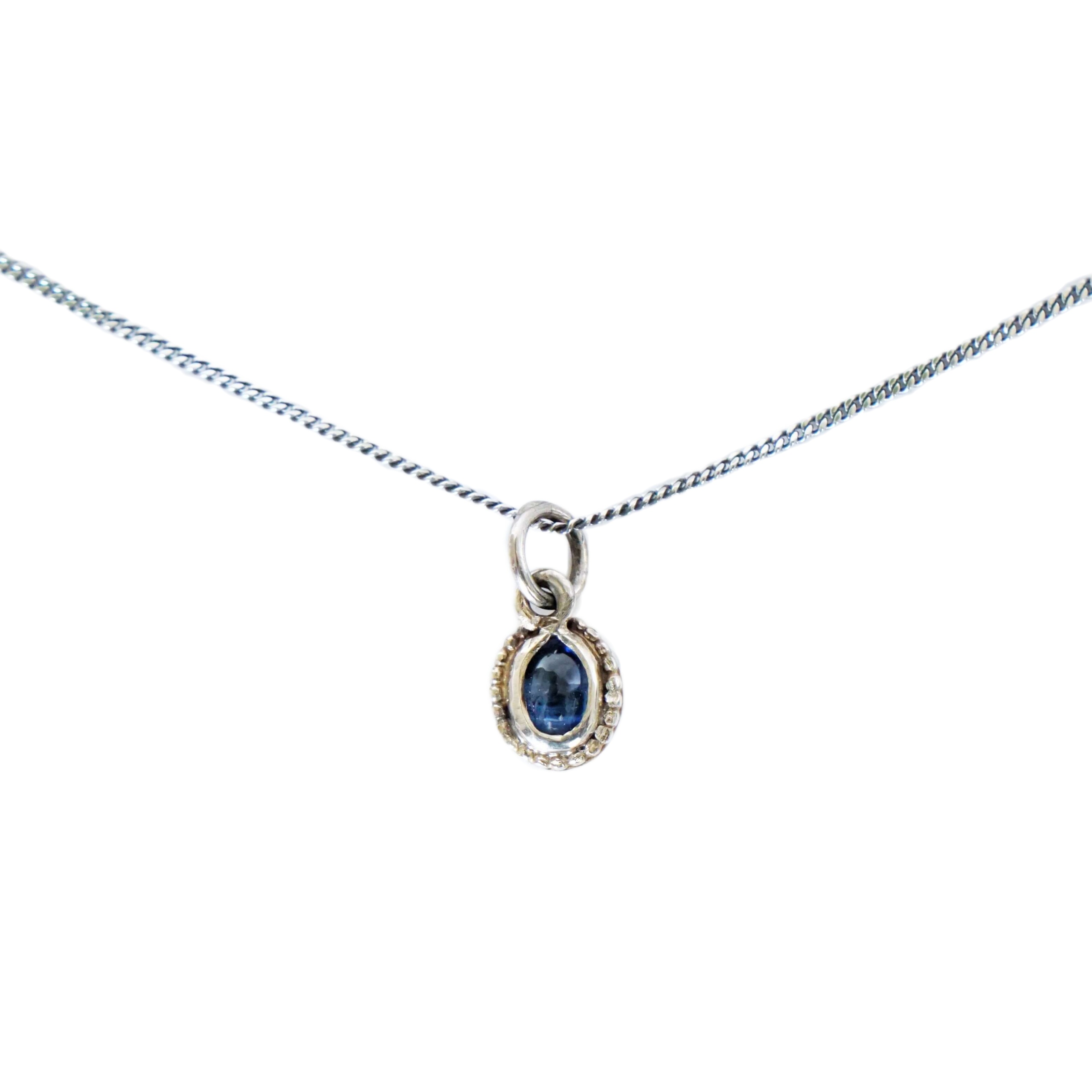 “Hangertje met donkerblauwe, transparante kyaniet. Om de steen zit een pareldraad, deze is her en der beschadigd. De hanger is 11 bij 7,5 mm en wordt geleverd inclusief ketting.”
