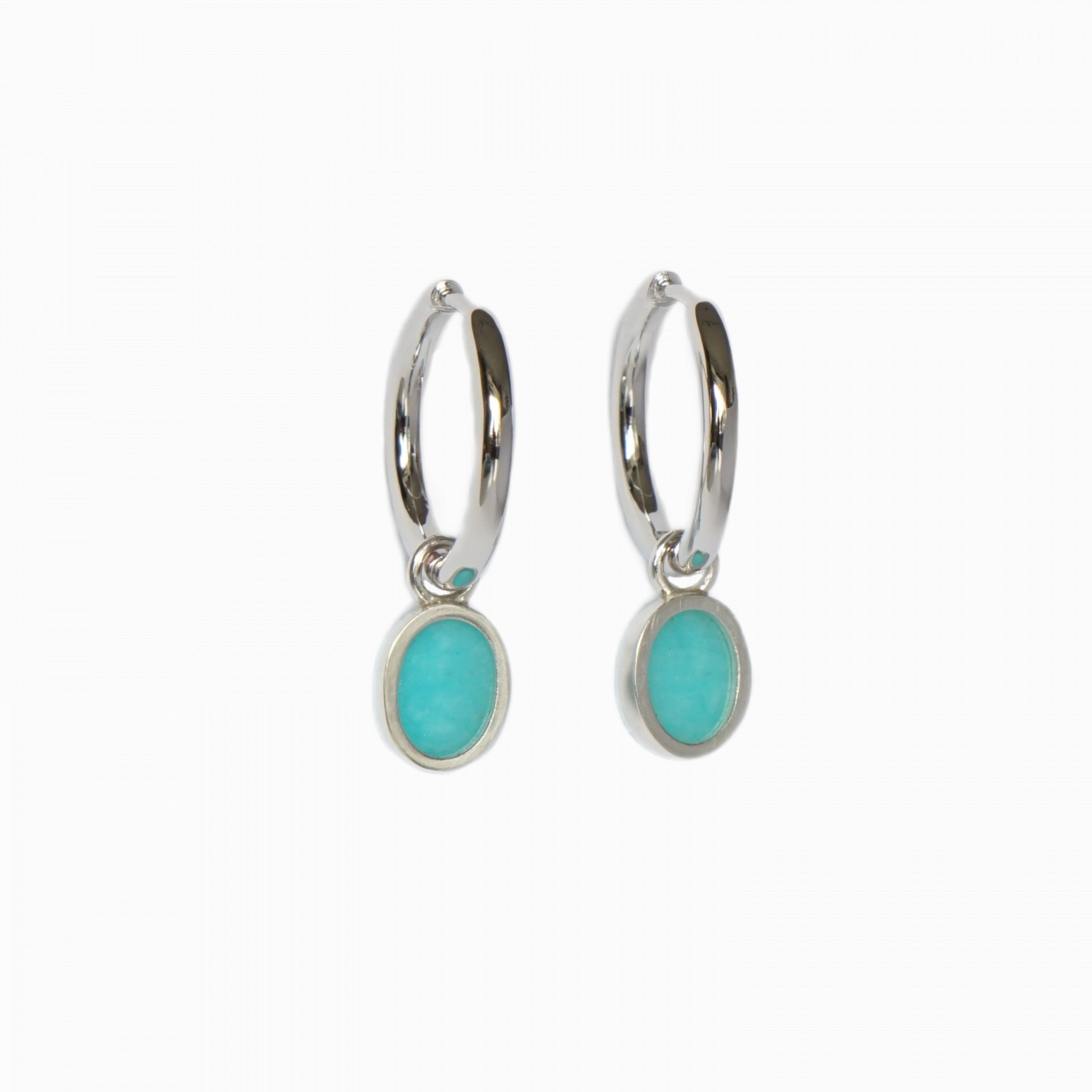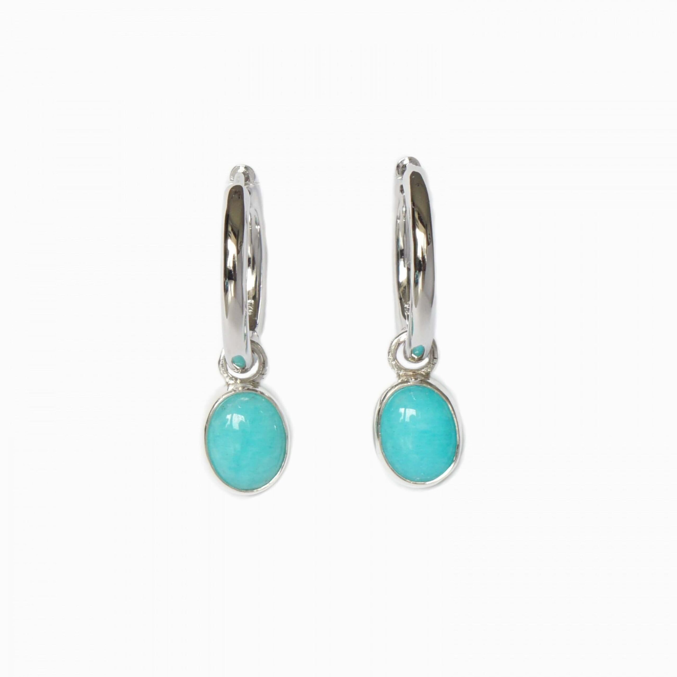 “Sterling zilveren klapcreool oorbellen met amazoniet bedels. De bedels zijn handgemaakt en hebben een open achterkant. De creolen zijn gerhodineerd en kunnen ook zonder bedels gedragen worden. De creolen zijn 20 mm en de amazoniet cabochons zijn 10 x 8 mm groot.”